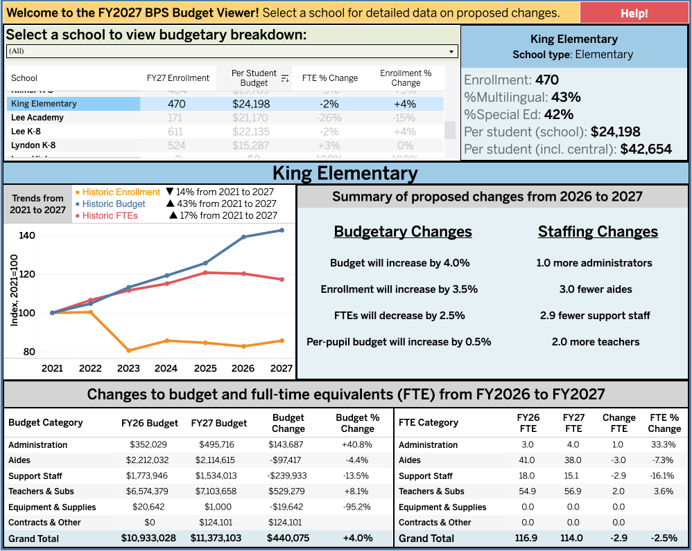 The tool allows you to explore school-level changes and easily see the individual changes coming in the next year. In the screenshot above, we can see that King Elementary is predicted to see a 3.5% increase in enrollment over the next year, and a corresponding 4% increase in budget. However, it will see a decrease in staffing, including the elimination of 6 aides and support staff alongside 2 more teachers and 1 more administrator. The chart on the left of the interface shows how the school has changed over time. In this case, King Elementary has seen a 14% reduction in enrollment since 2021 – but a greater than 40% increase in total budget.