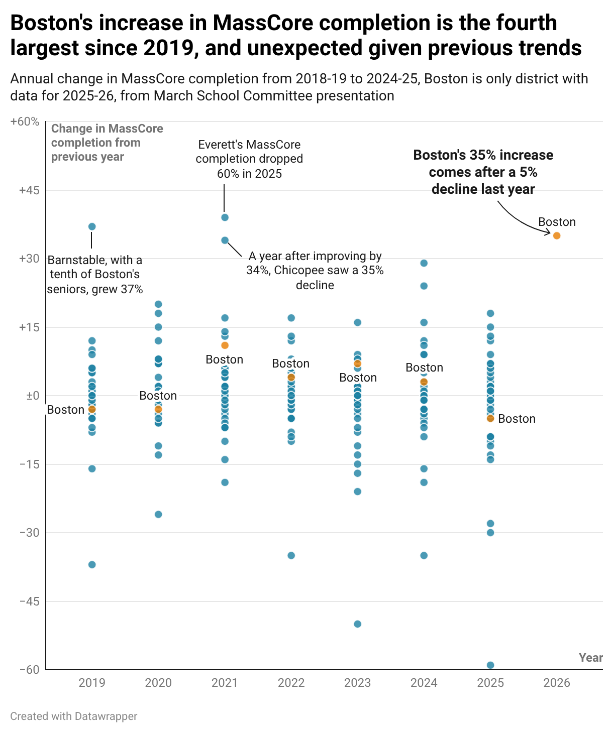 As we have covered previously, Boston has struggled to have its seniors meet the MassCore standard. In 2021, the district adopted it as a future graduation standard for the class of 2026. At the time, just 31% of seniors fulfilled the MassCore requirements. As of 2025, only 46% of students completed MassCore. After years of minimal progress, it was thus when BPS announced last night that 81% of seniors have now completed MassCore. This near doubling of MassCore completion taking place seemingly overnight is hard to square with the district’s previously languid pace. This chart shows the stunning reversal and 35% year-over-year increase that followed a decline from 2024 to 2025.