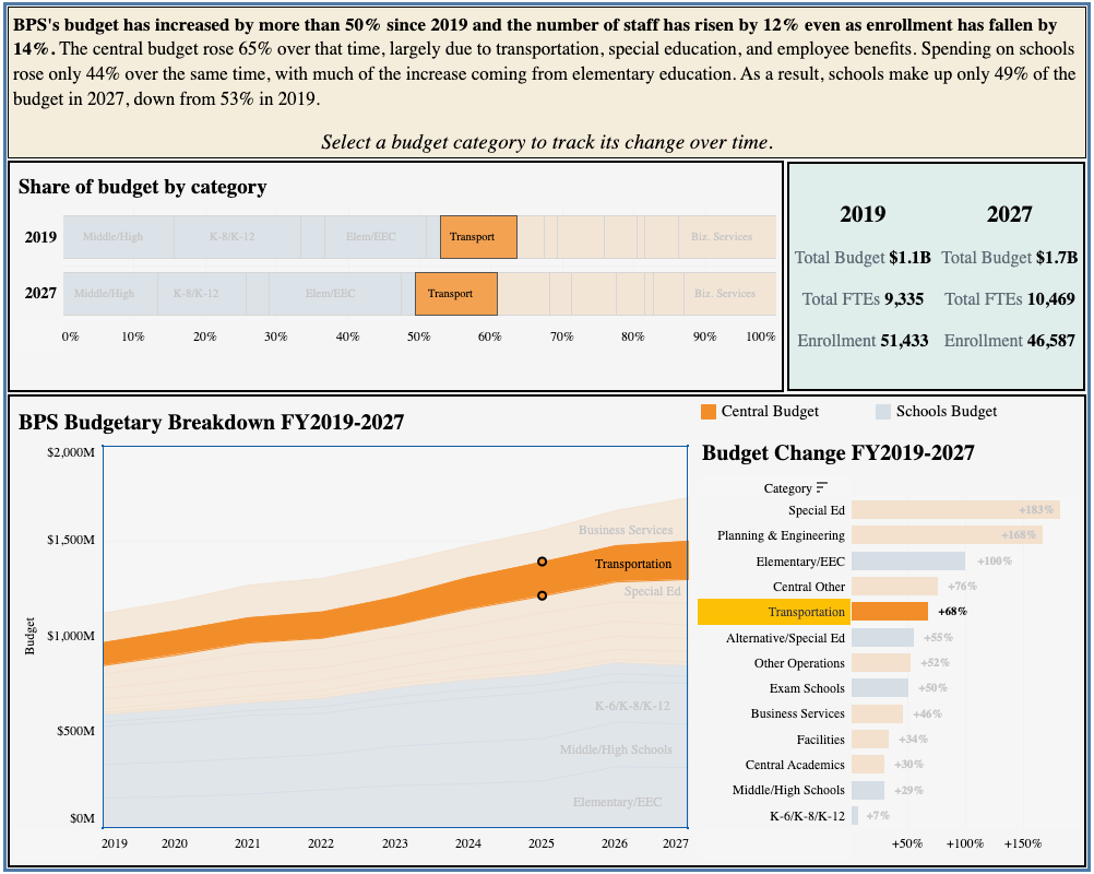 In 2027, BPS will spend over $36,820 per student, up from $20,373 in 2019. Across the board, BPS spends more to educate fewer students every year. While some of these increases are certainly worthwhile, the current trajectory is not sustainable. There is no ‘silver bullet’ to bring costs down, and no single outsized cost or program is to blame. A deep, honest, look at how and why BPS spends what it does is critical for the continued function and success of the district and its students. We hope that this budget tool can help contribute to this necessary conversation.